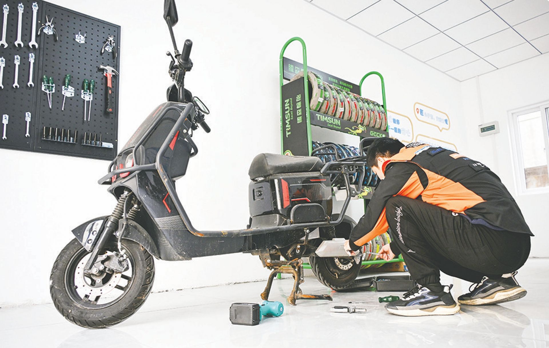 公寓一层设有简易修车点,常用工具整齐挂在墙上,还有老师傅每周数次驻点服务。“虽然我车还没修过,”滕后峰拍拍自己的电动车,“但知道有这服务,心里踏实。”